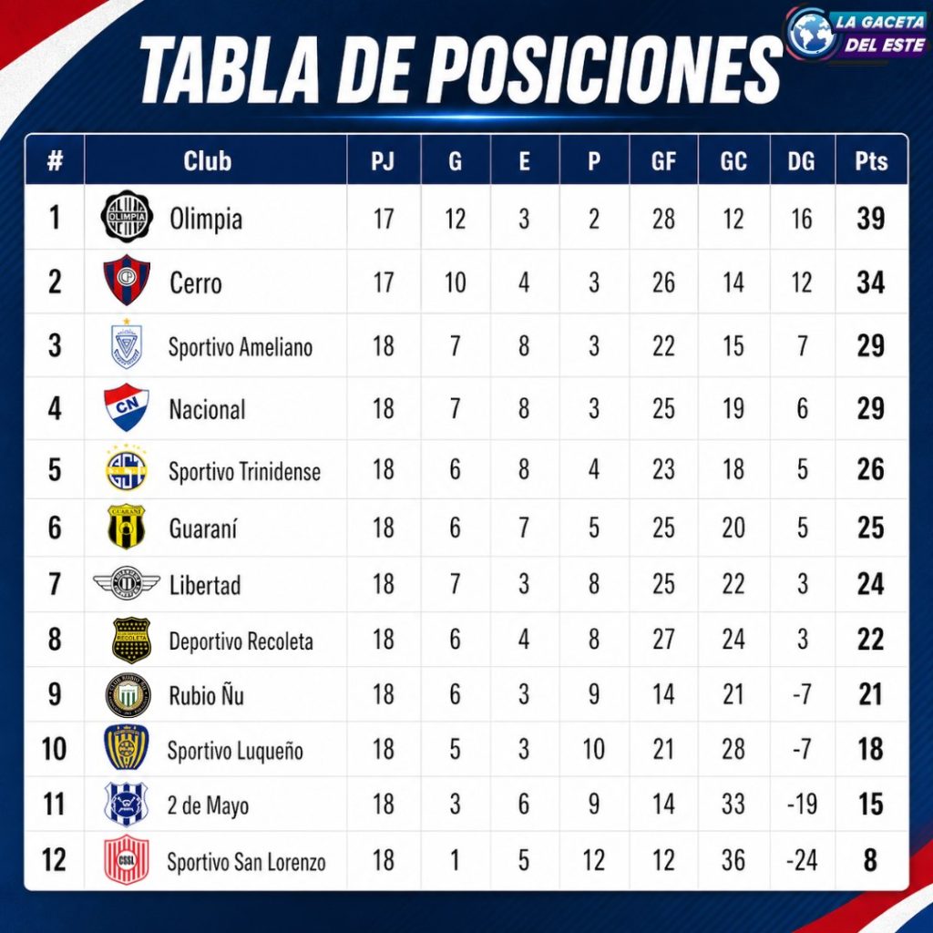 Con 39 puntos en 17 partidos, Olimpia sigue firme como líder del campeonato y marca distancia en la tabla, aunque el último fin de semana perdió un partido ante Libertad.