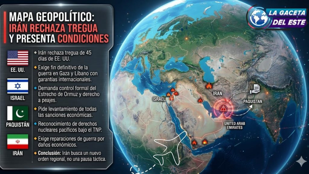 Teherán ha declinado oficialmente la propuesta de EE. UU. de un alto el fuego de 45 días, alegando que no aceptará «pausas tácticas» . En su lugar, ha presentado cinco condiciones no negociables que buscan redefinir el equilibrio de poder: