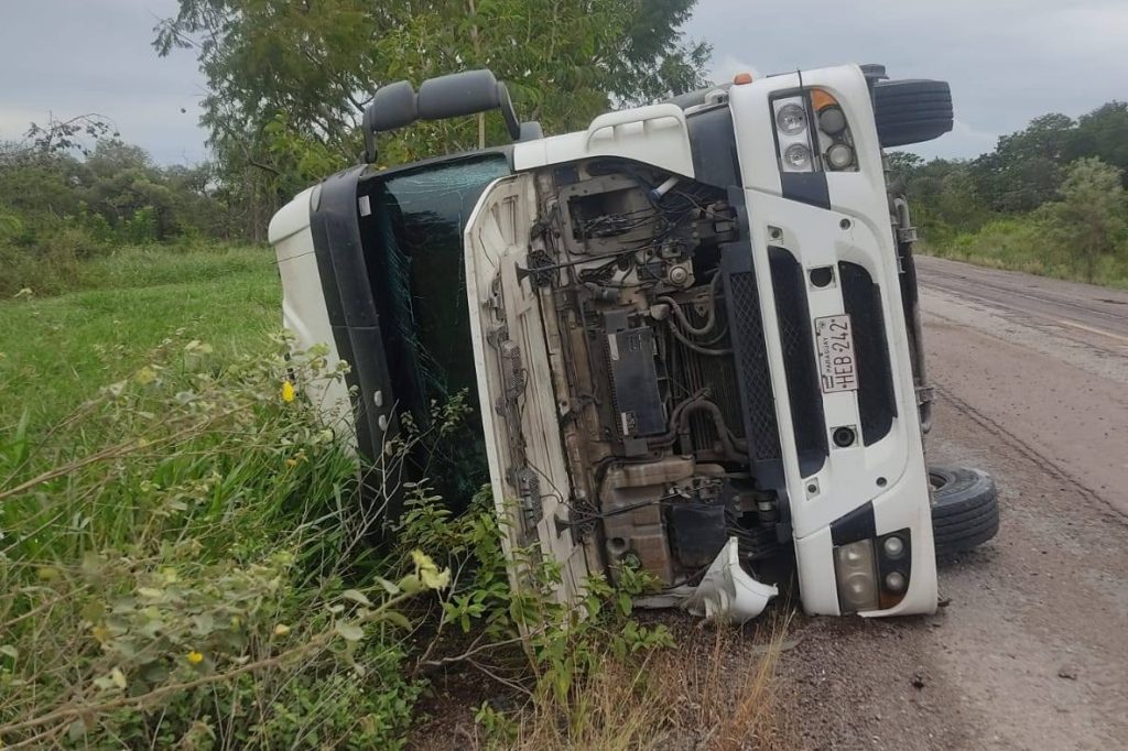 Según el informe policial, el siniestro ocurrió cuando otro camión frenó bruscamente para esquivar un pozo, obligando al conductor a maniobrar, momento en que perdió el control al caer en otro bache, terminando volcado a un costado de la ruta.